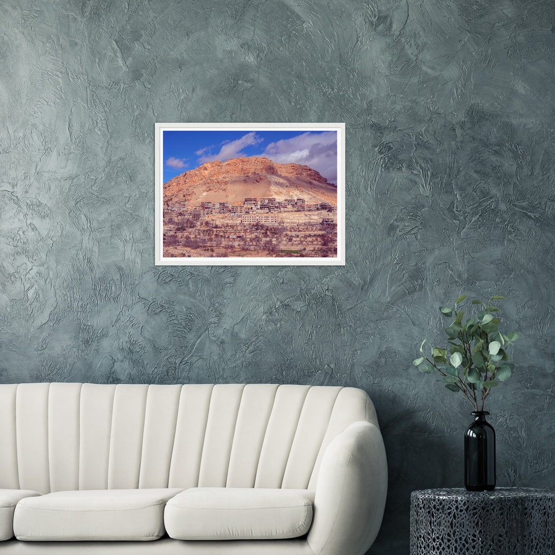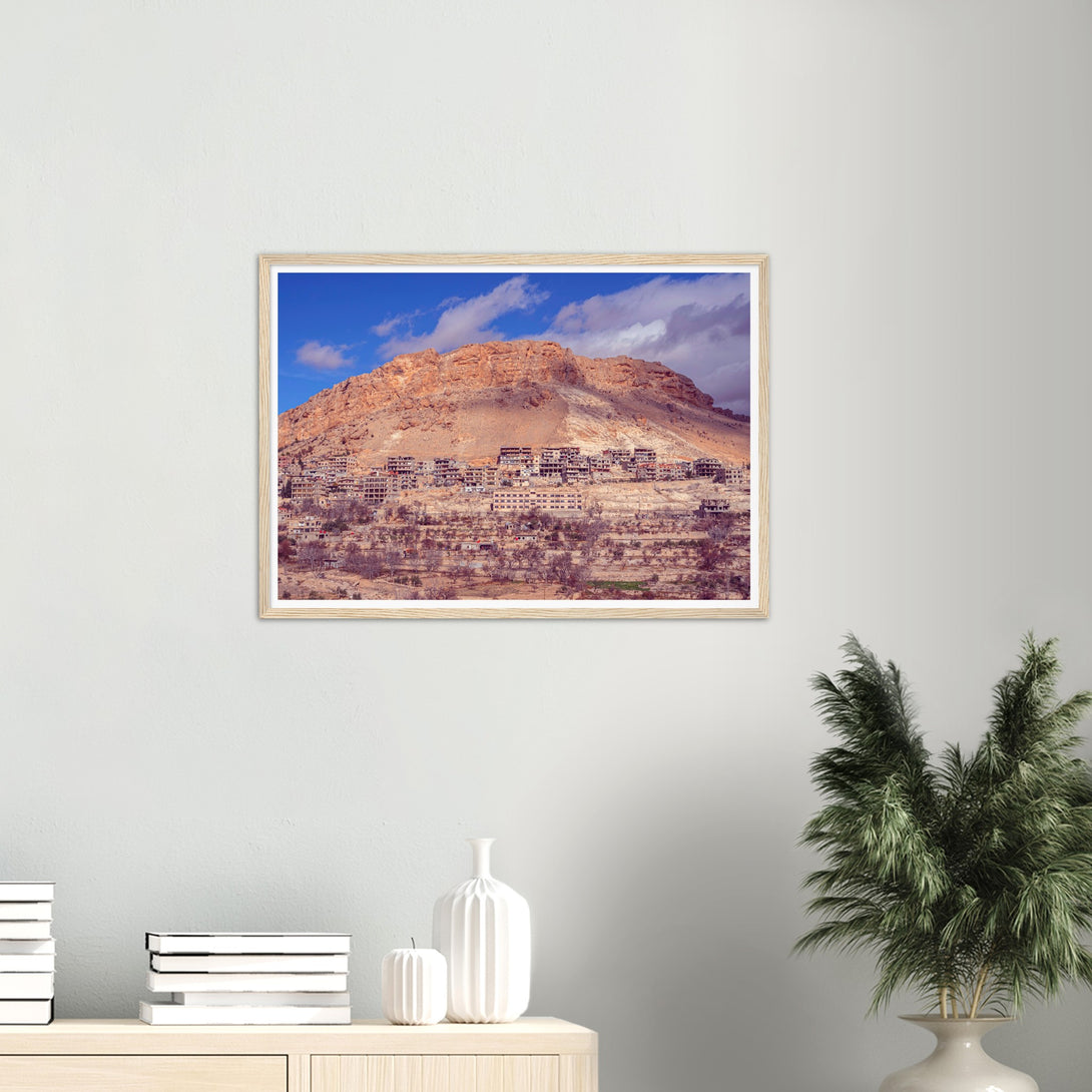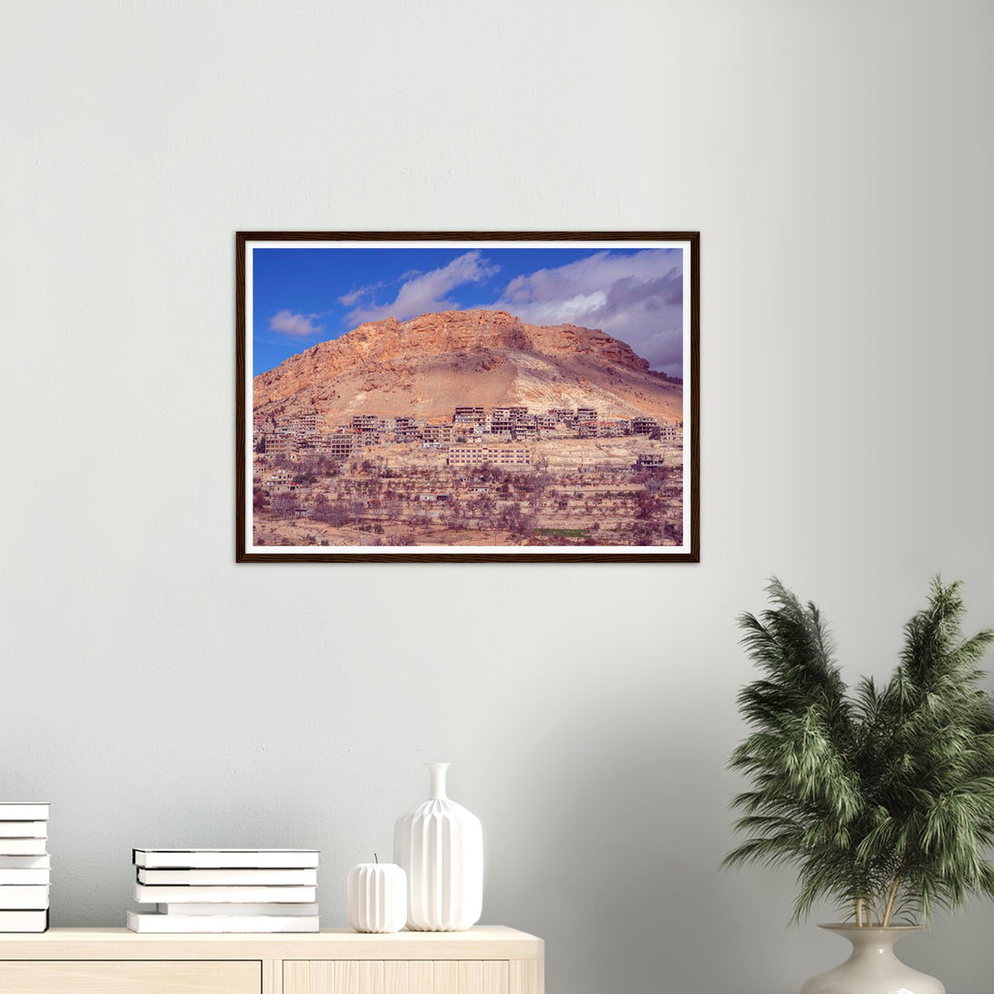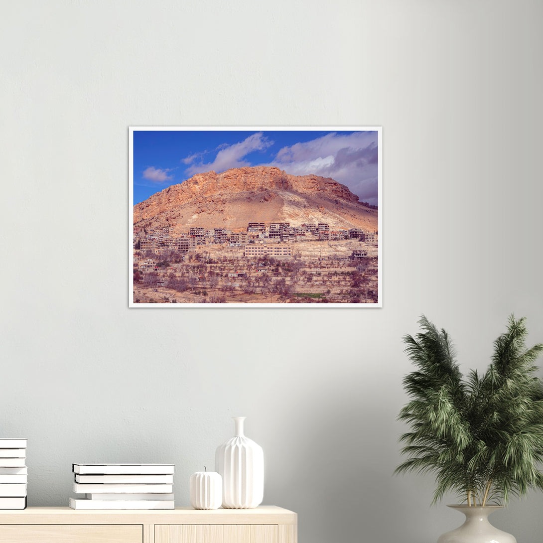 This poster shows The town of Maaloula located in south Syria, located in a mountainous area. It was built into the ragged mountainside and is famous for its Greek Orthodox Christian community who speak Aramaic, the language of Jesus Christ.