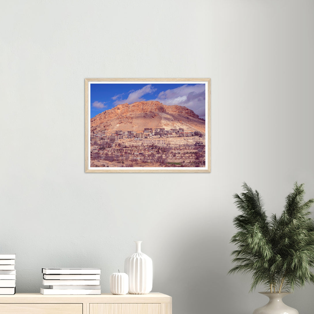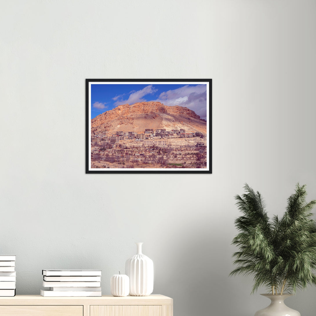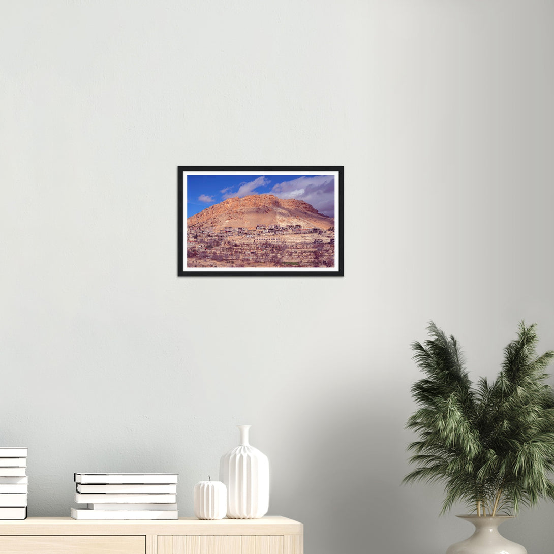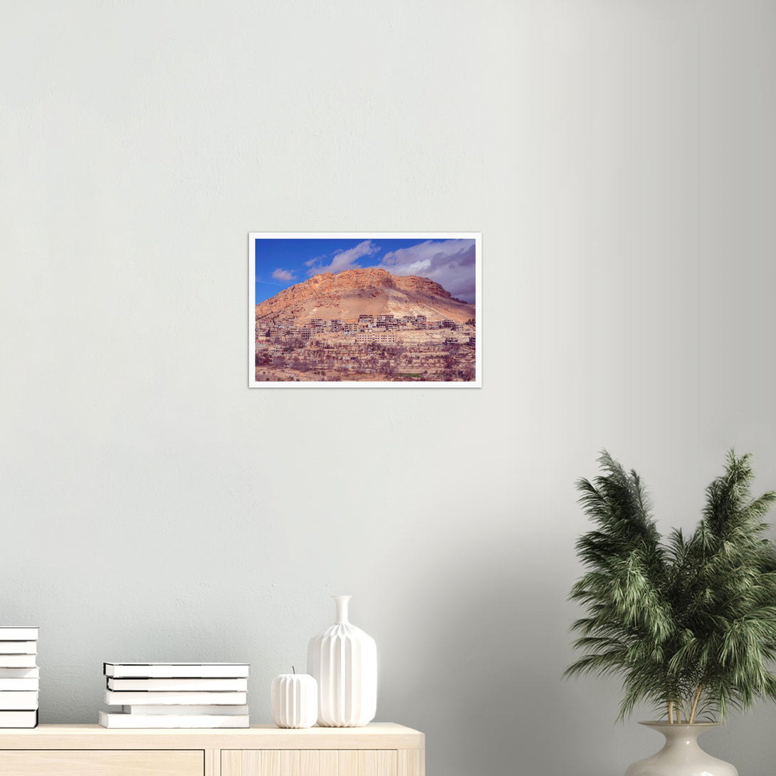 This poster shows The town of Maaloula located in south Syria, located in a mountainous area. It was built into the ragged mountainside and is famous for its Greek Orthodox Christian community who speak Aramaic, the language of Jesus Christ.