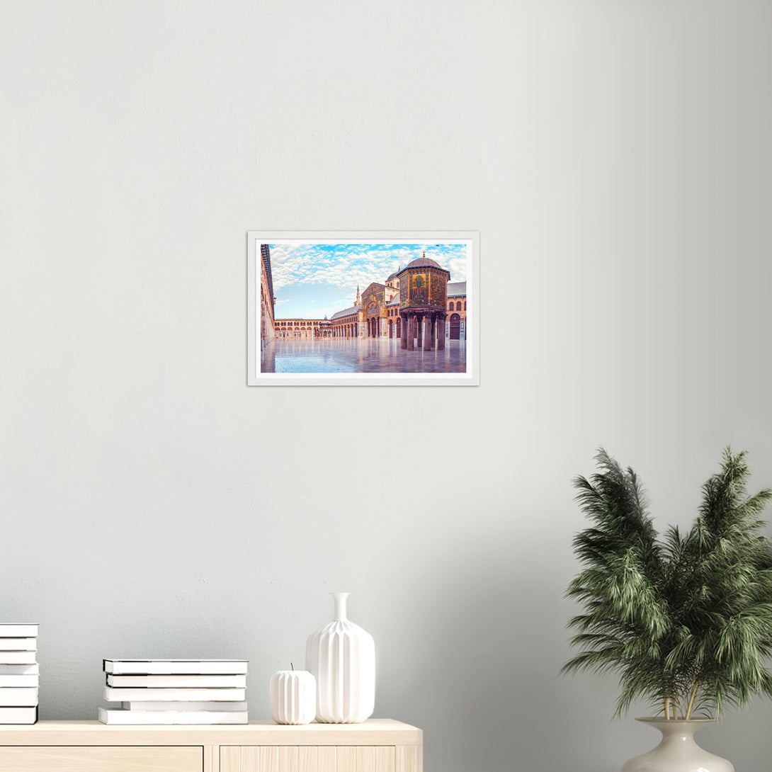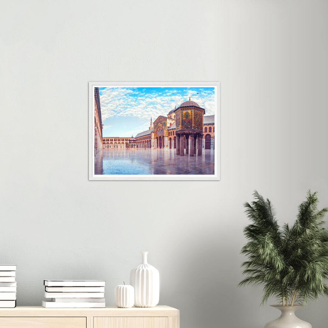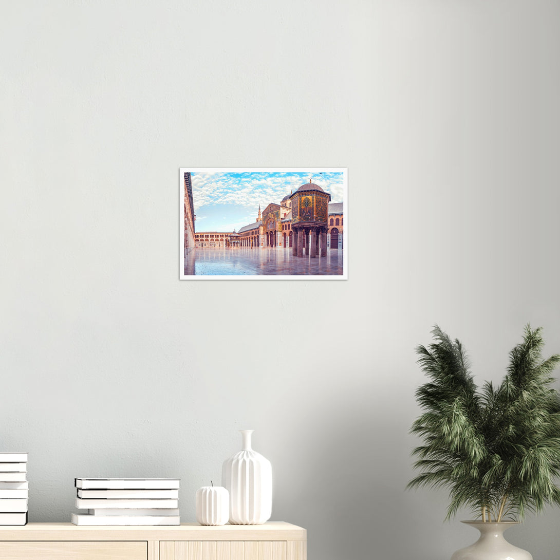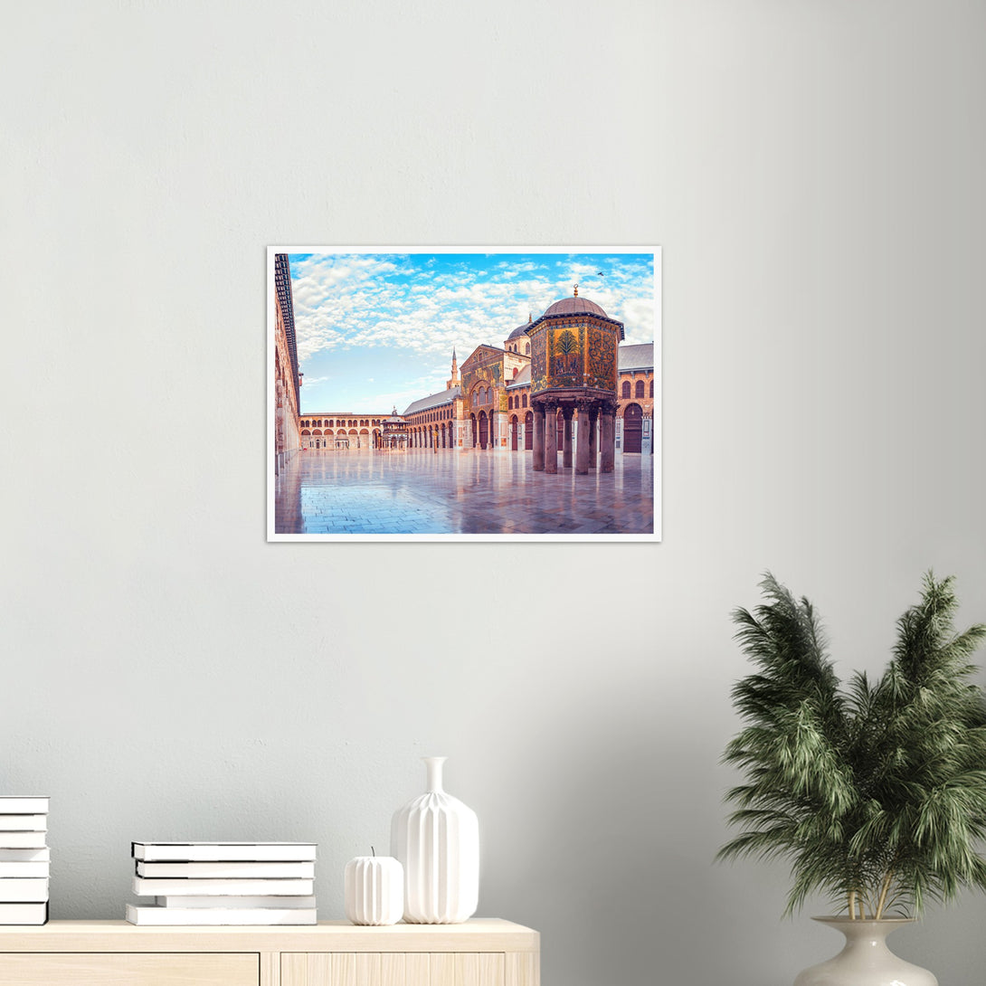 This is a poster of the Umayyad Mosque in Damascus, Syria. It shows a panoramic view of the wonderful mosque under the blue sky and white clouds on a sunny day.