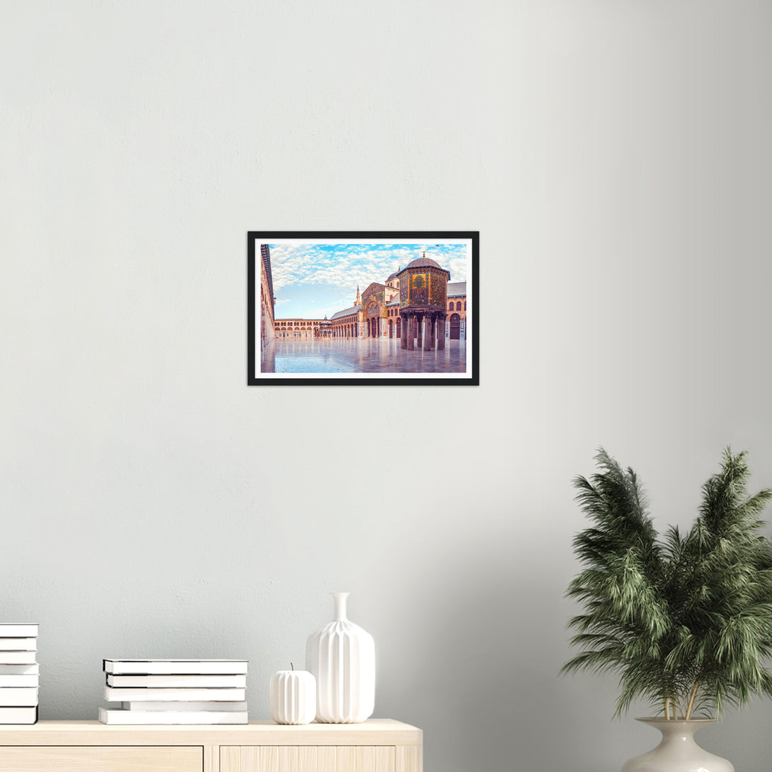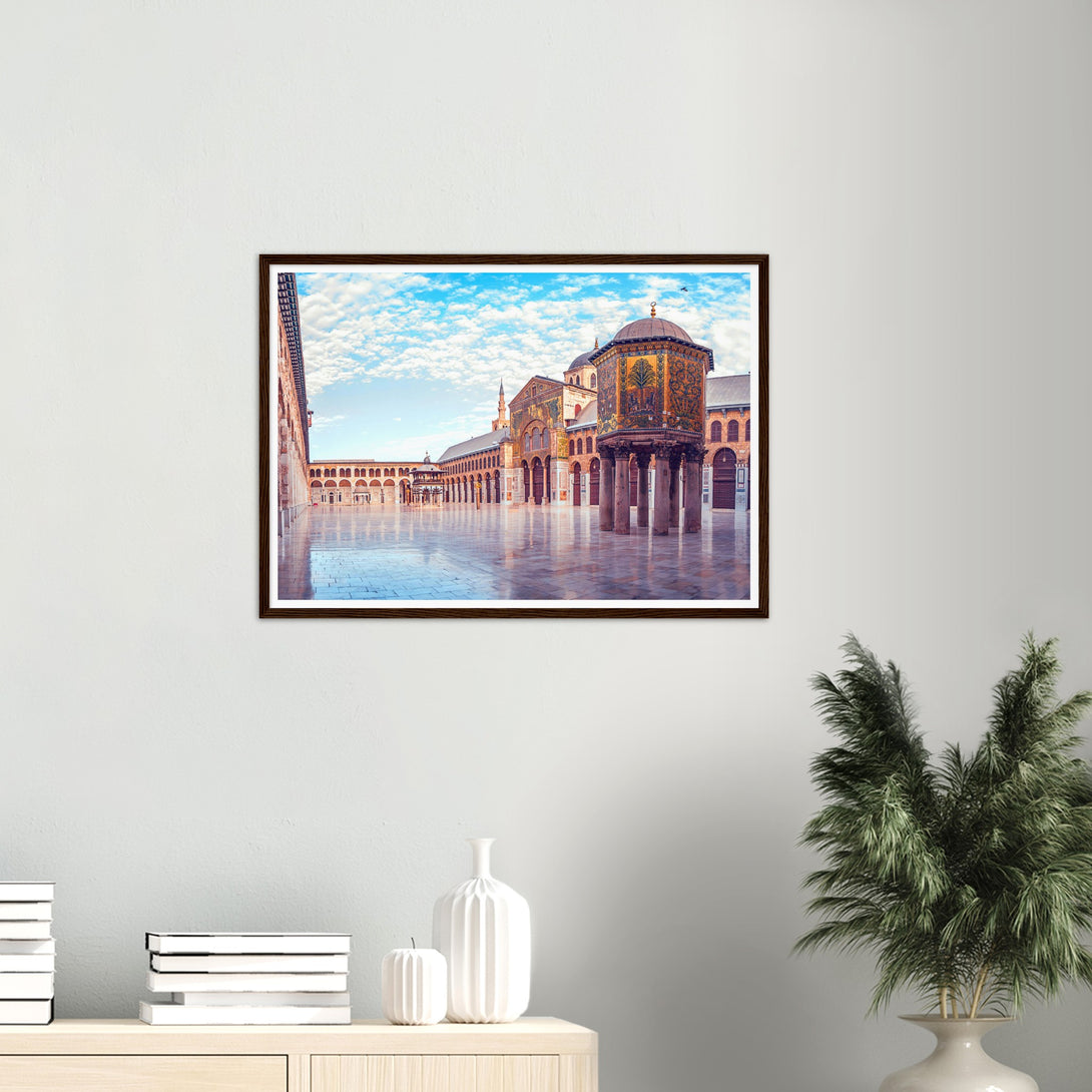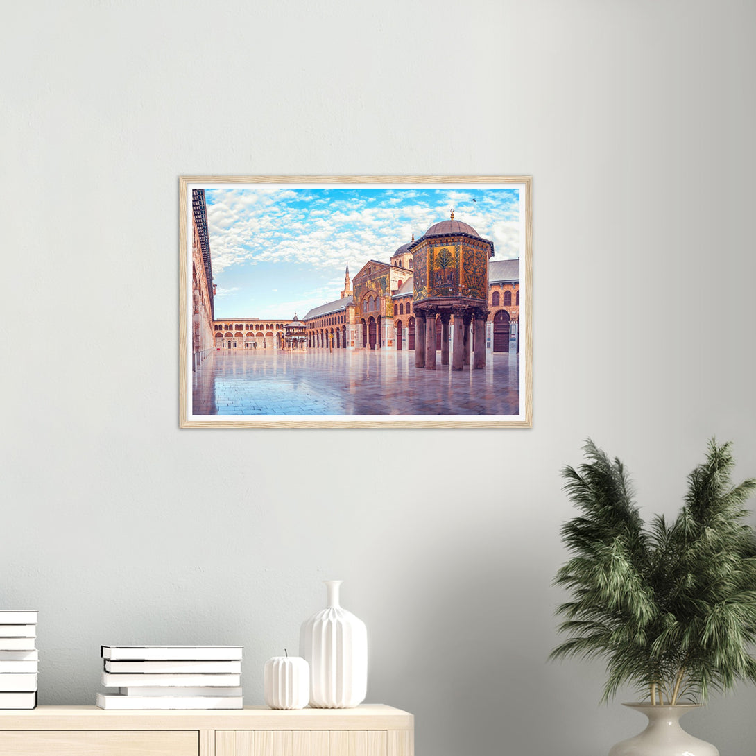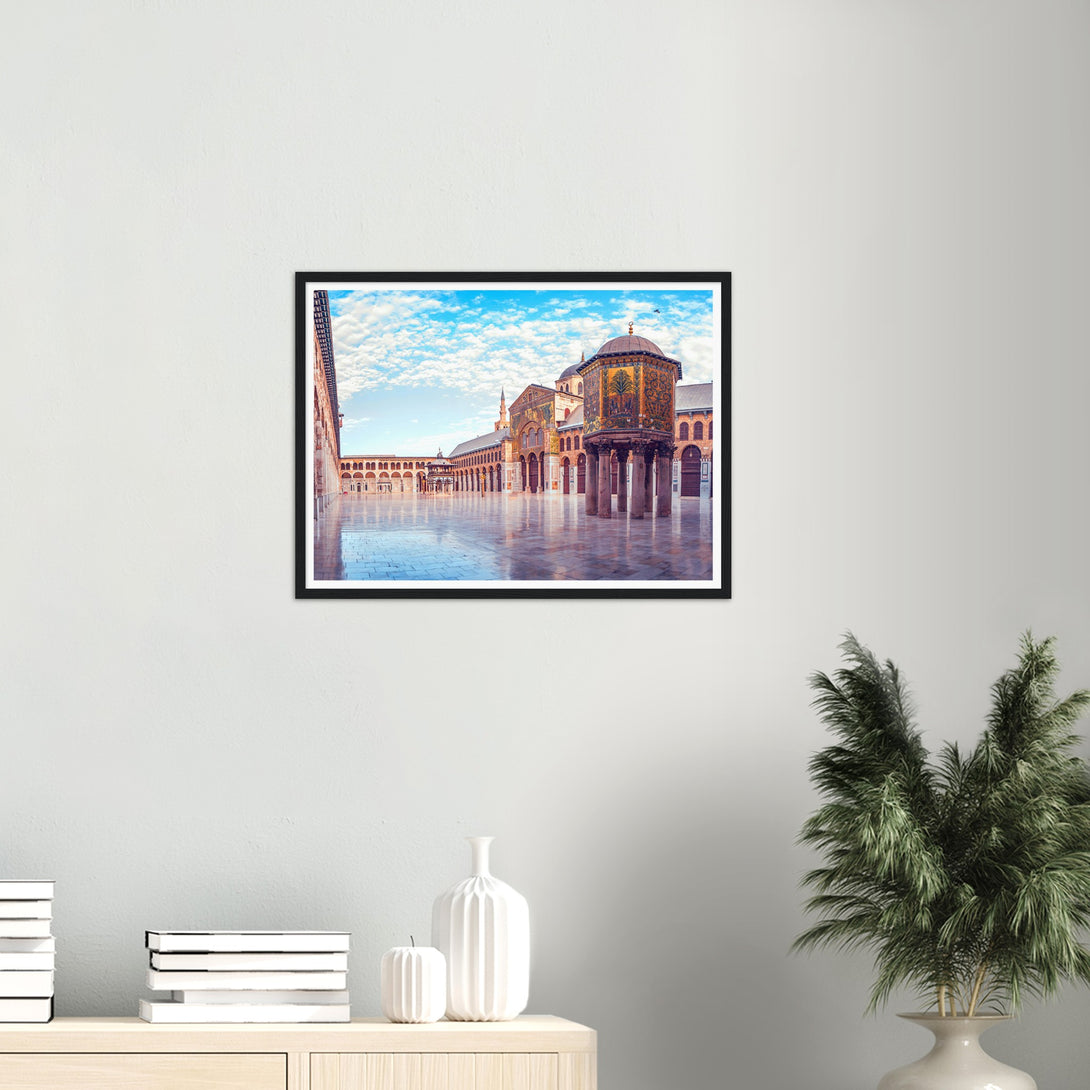 This is a poster of the Umayyad Mosque in Damascus, Syria. It shows a panoramic view of the wonderful mosque under the blue sky and white clouds on a sunny day.